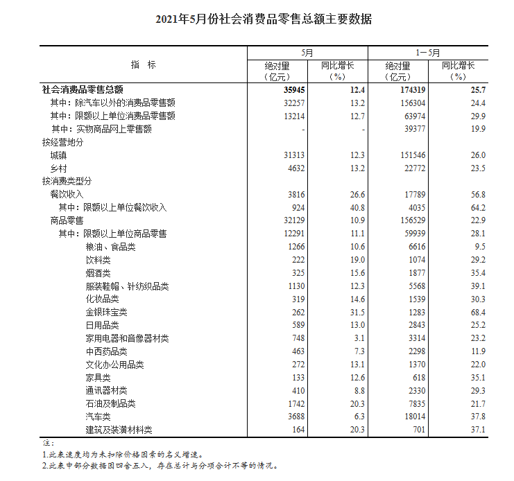 按经营单位所在地分,5月份,城镇消费品零售额31313亿元,同比增长12.3%,两年平均增长4.5%;乡村消费品零售额4632亿元,增长13.2%,两年平均增长4.7%。1—5月份,城镇消费品零售额151546亿元,同比增长26.0%,两年平均增长4.4%;乡村消费品零售额22772亿元,增长23.5%,两年平均增长3.7%。