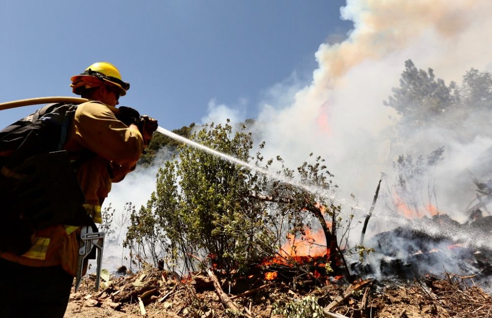 2020年8月2日,消防员在美国加利福尼亚州河滨县应对快速蔓延的山火。(新华社发)