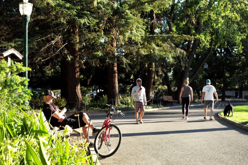 6月14日,人们在美国加利福尼亚州北部圣马特奥的中央公园休闲。(新华社记者吴晓凌摄)