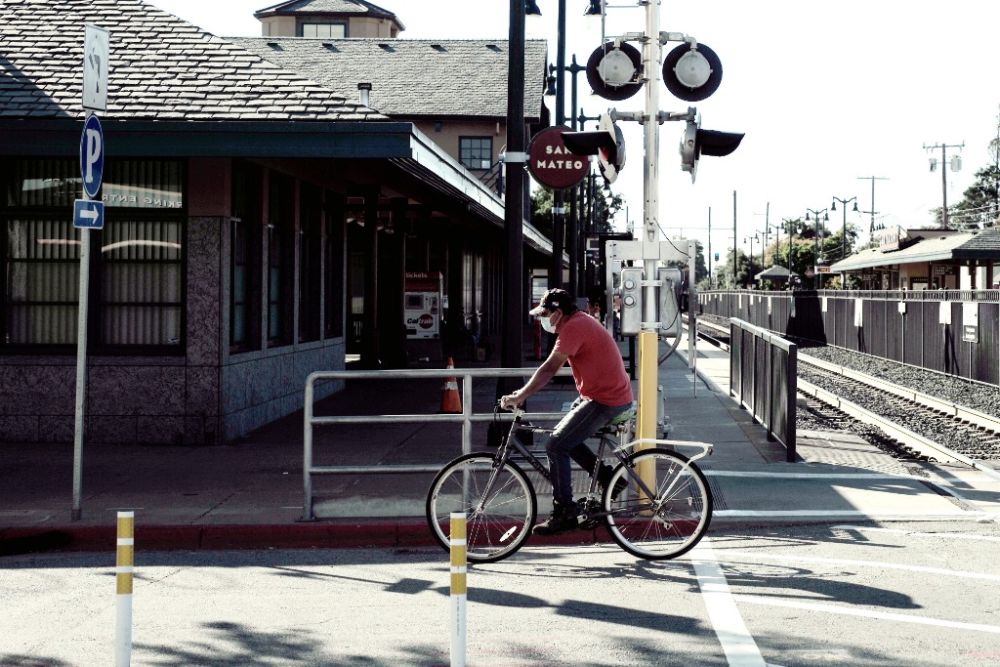6月14日,一名男子在美国加利福尼亚州北部圣马特奥街头骑行。(新华社记者吴晓凌摄)