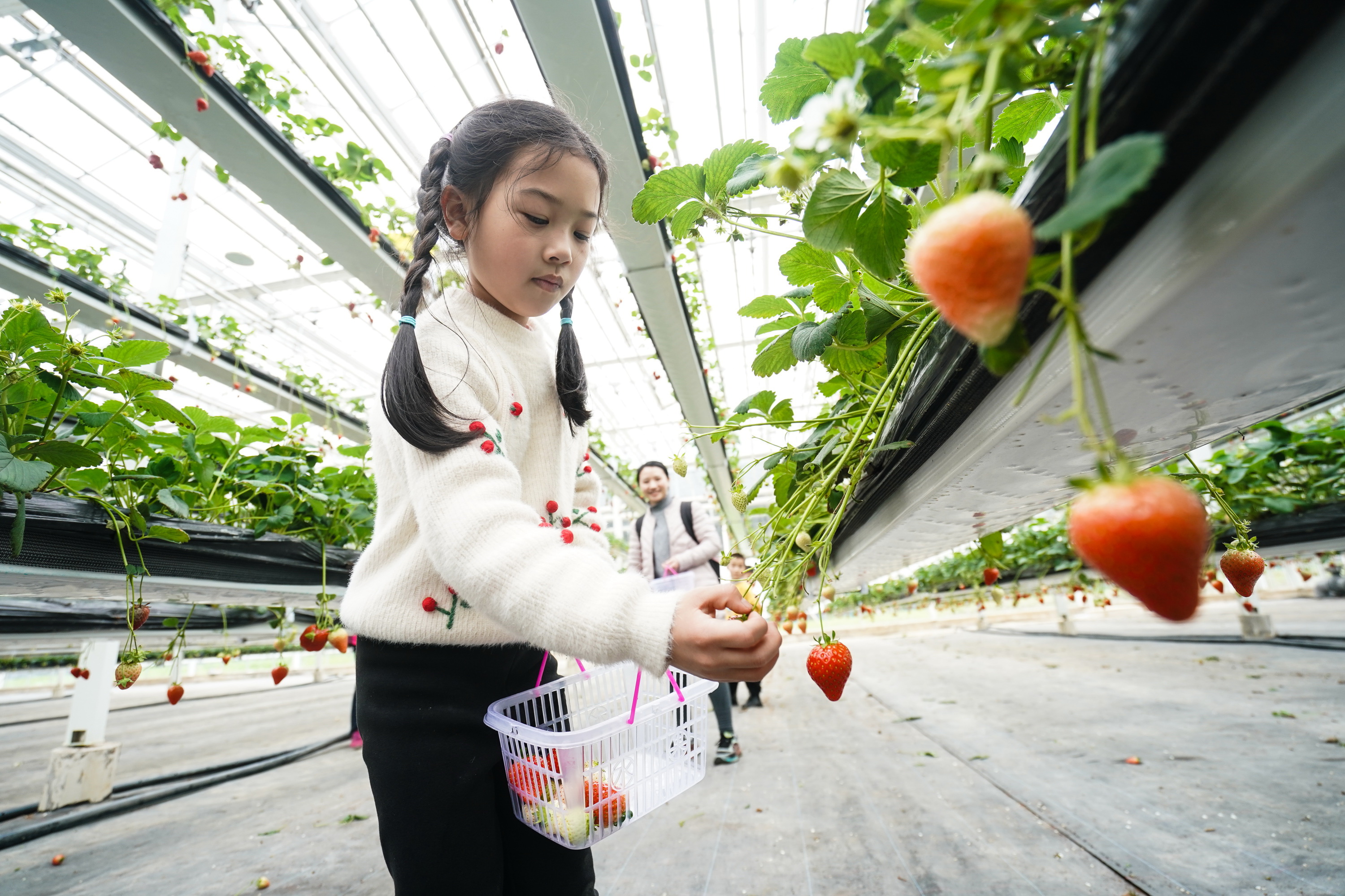 ↑在南京市溧水区傅家边精品草莓生活馆,游客在采摘草莓。新华社记者季春鹏摄