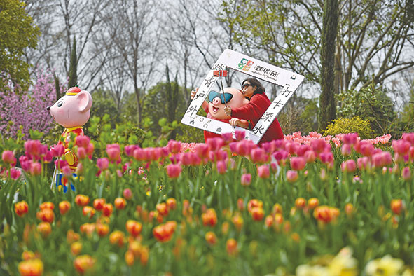 ↑3月13日,游人在南京市溧水区梦华苑自拍留念。新华社记者季春鹏摄
