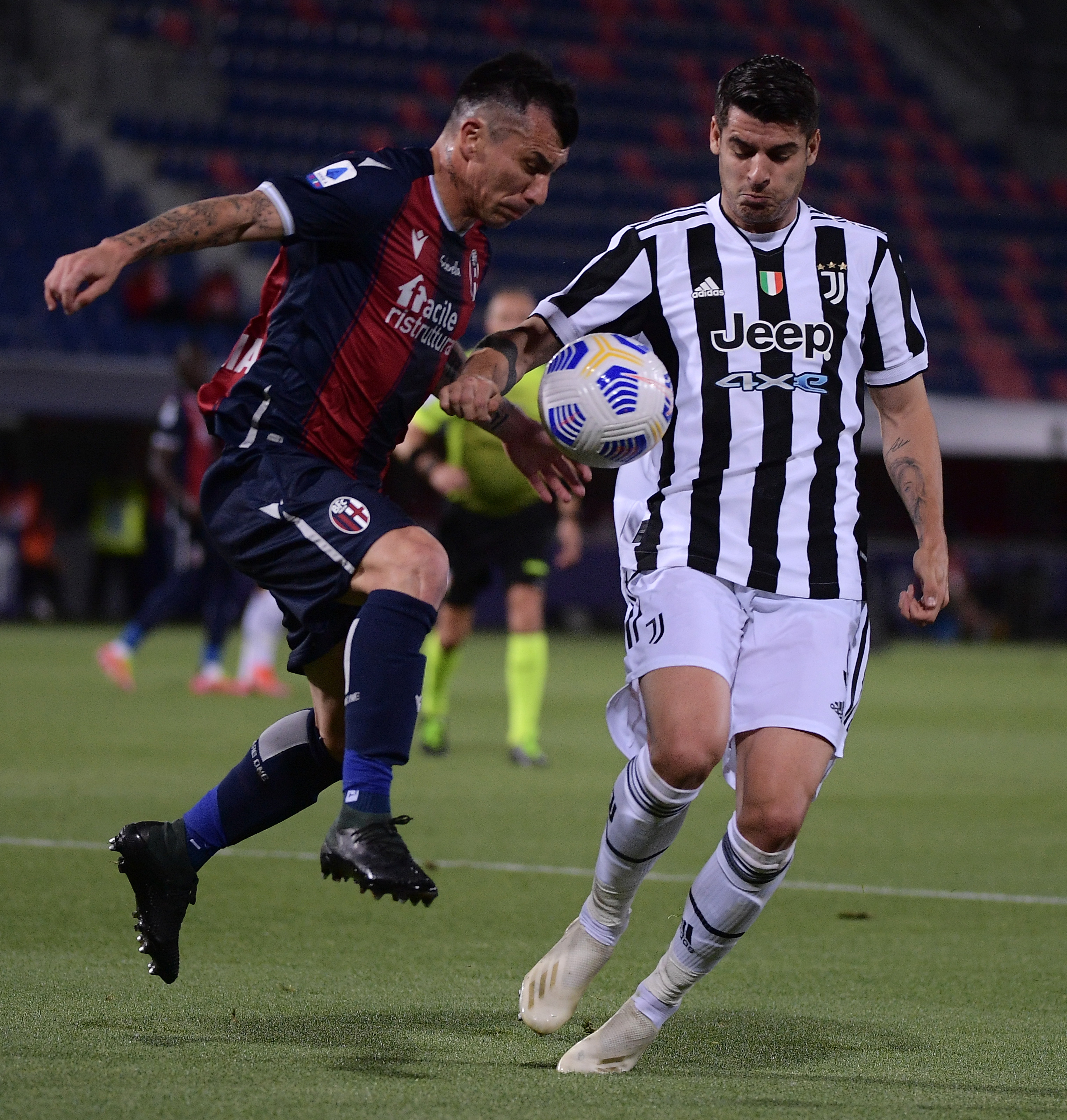 5月23日,尤文图斯队球员莫拉塔(右)与博洛尼亚队球员梅德尔拼抢。新华社发费德里科·塔尔迪托摄