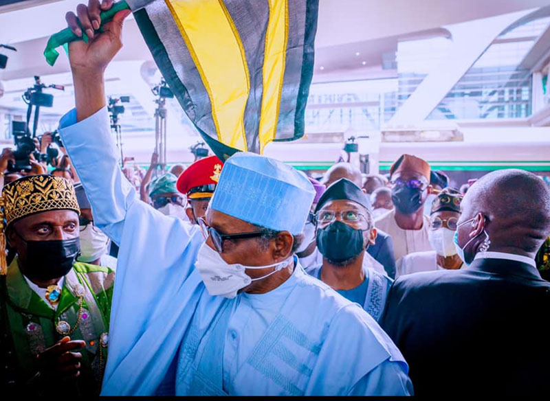 △尼日利亚总统布哈里挥舞指令旗 图片来源:尼日利亚总统府社交媒体账号