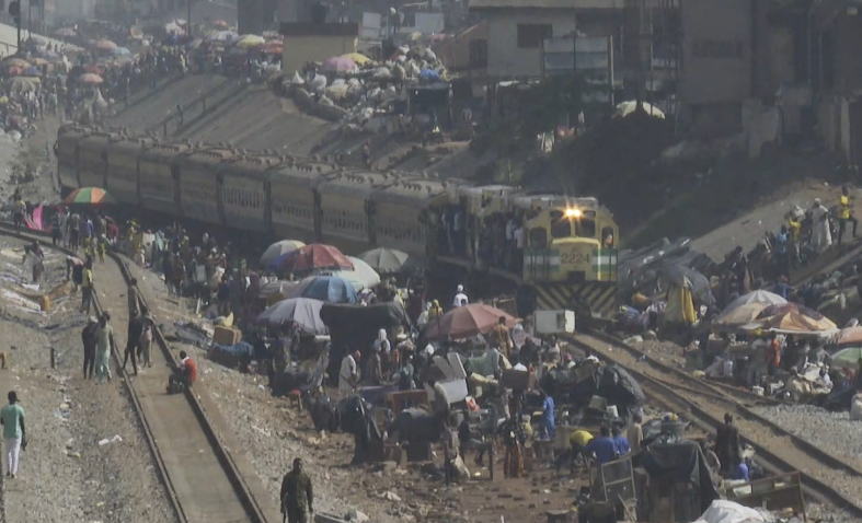 △图为拉伊铁路列车穿过当地居民社区 图片来源:中土尼日利亚公司