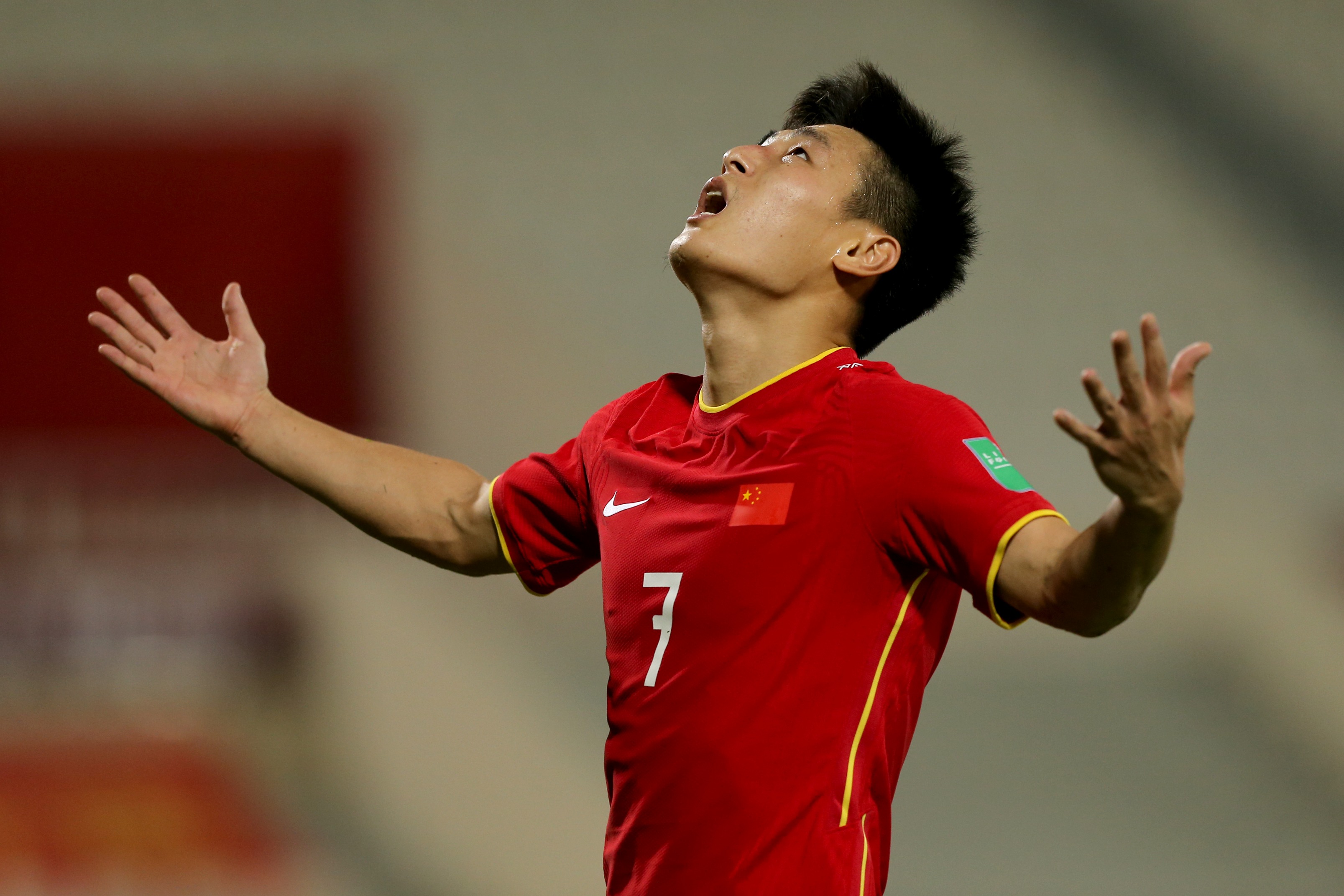 6月15日,中国队球员武磊庆祝进球。新华社发