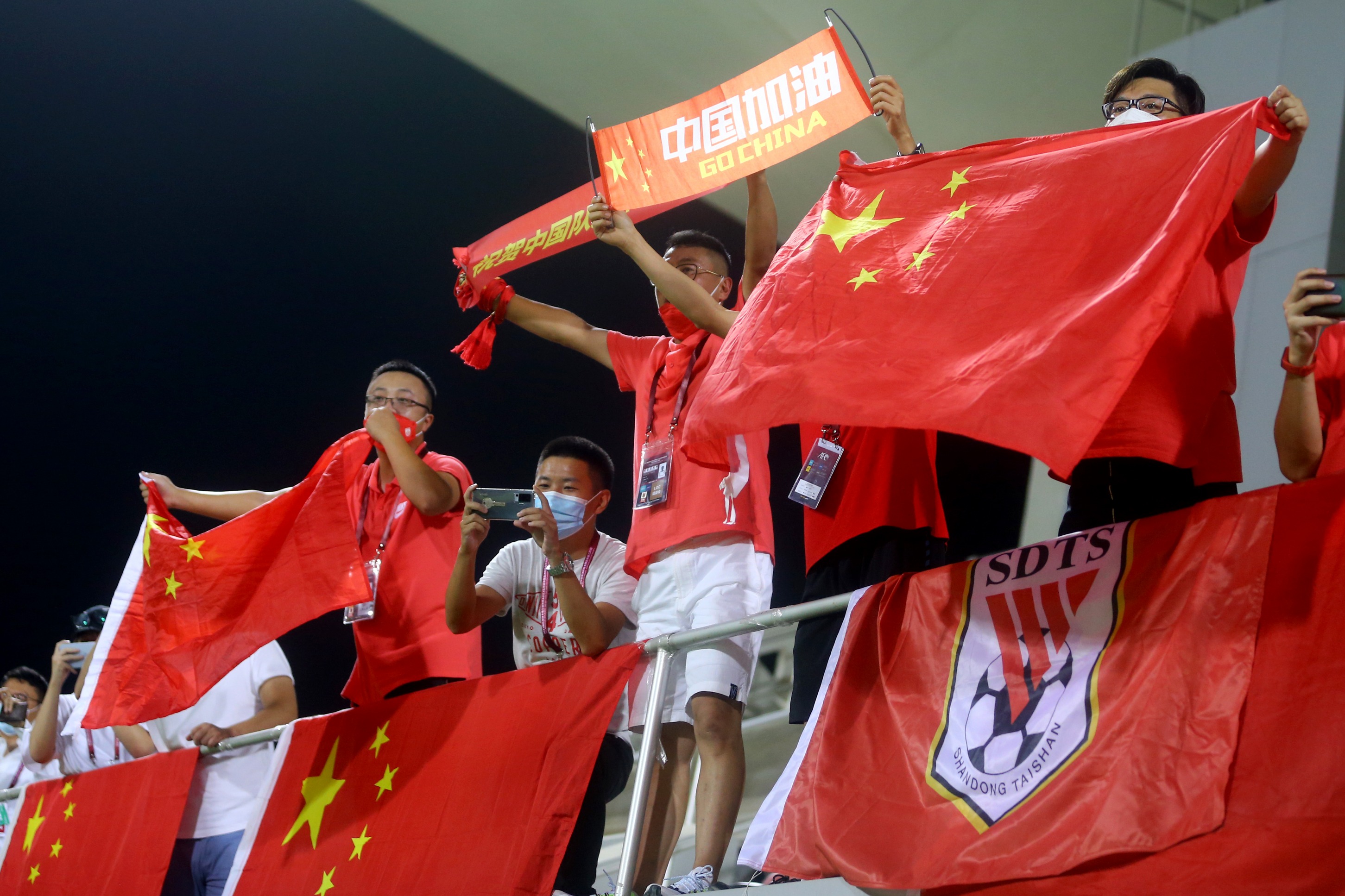 6月15日,现场观战的中国队球迷为球队加油助威。新华社发