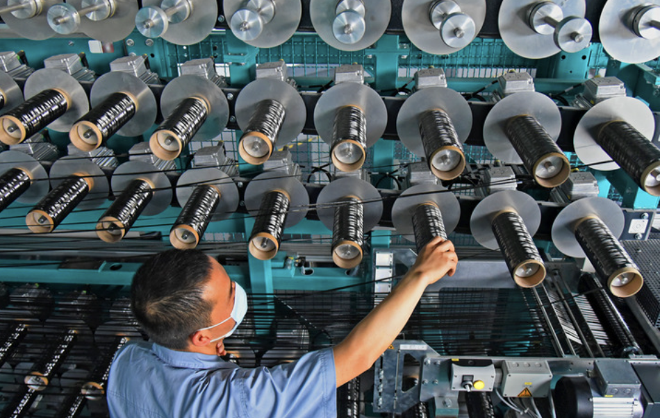 在江苏连云港经济技术开发区,工人在查看碳纤维生产线运行情况。新华社发(耿玉和 摄)
