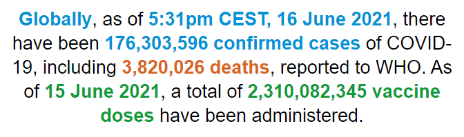根据世卫组织最新实时统计数据,截至欧洲中部夏令时间6月16日17时31分(北京时间6月16日23时31分),全球累计新冠肺炎确诊病例176303596例,累计死亡病例3820026例。16日全球新冠肺炎确诊病例新增307223例,死亡病例新增8212例。(总台记者 朱赫)