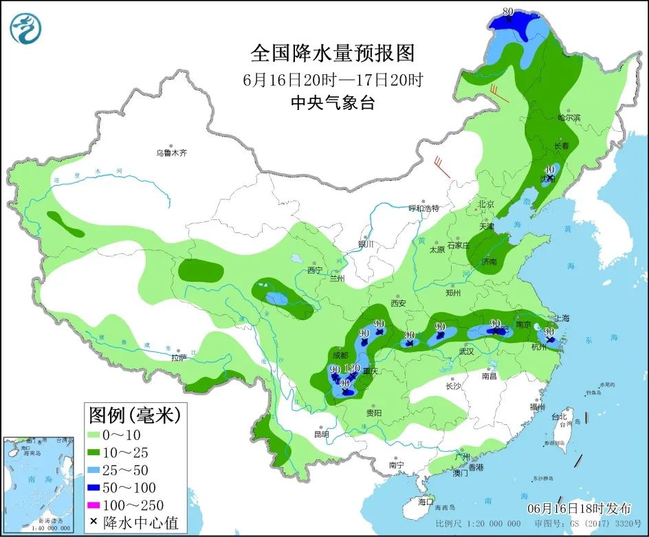 16日20时至17日20时,内蒙古东北部、东北地区西部、青海南部、山东西北部、四川盆地和川西高原南部、云南东北部和西部、江淮西部、江汉北部、江南东北部等地部分地区有中到大雨。