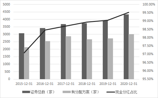 近六年A股上市公司分红家数及现金分红比例来源:同花顺