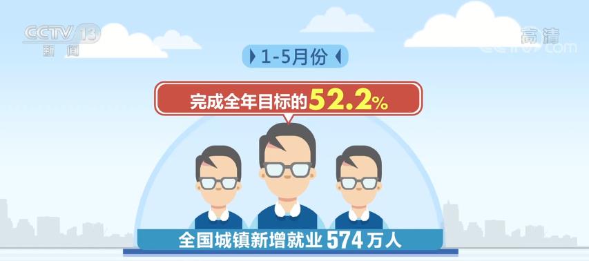 1—5月份,全国城镇新增就业574万人,完成全年目标的52.2%。5月份全国城镇调查失业率为5%,比4月份下降0.1个百分点,比上年同期下降0.9个百分点,总体就业形势在改善。