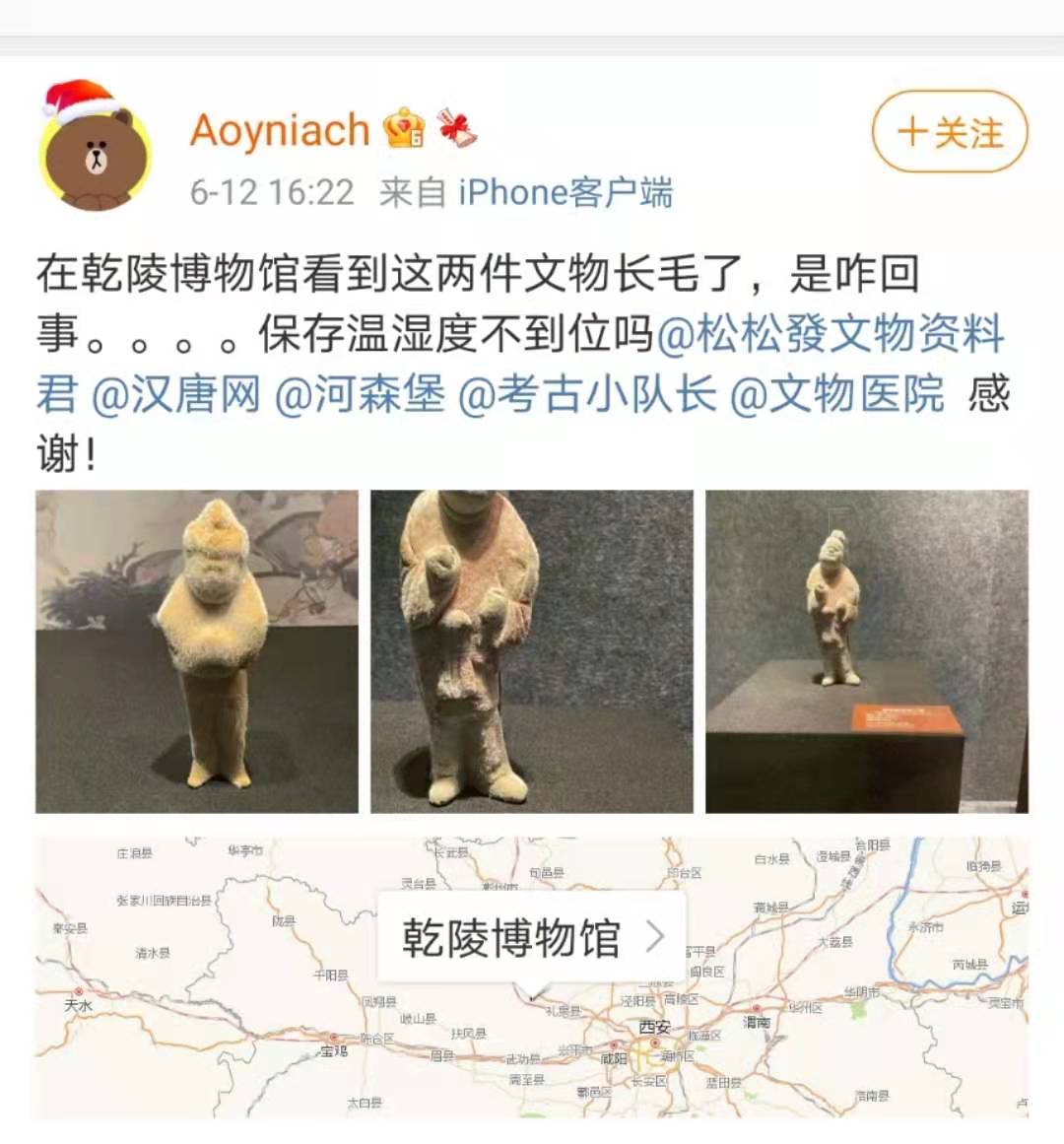 有网友反映,乾陵博物馆两件文物“长毛”。 微博网友“Aoyniach”截图