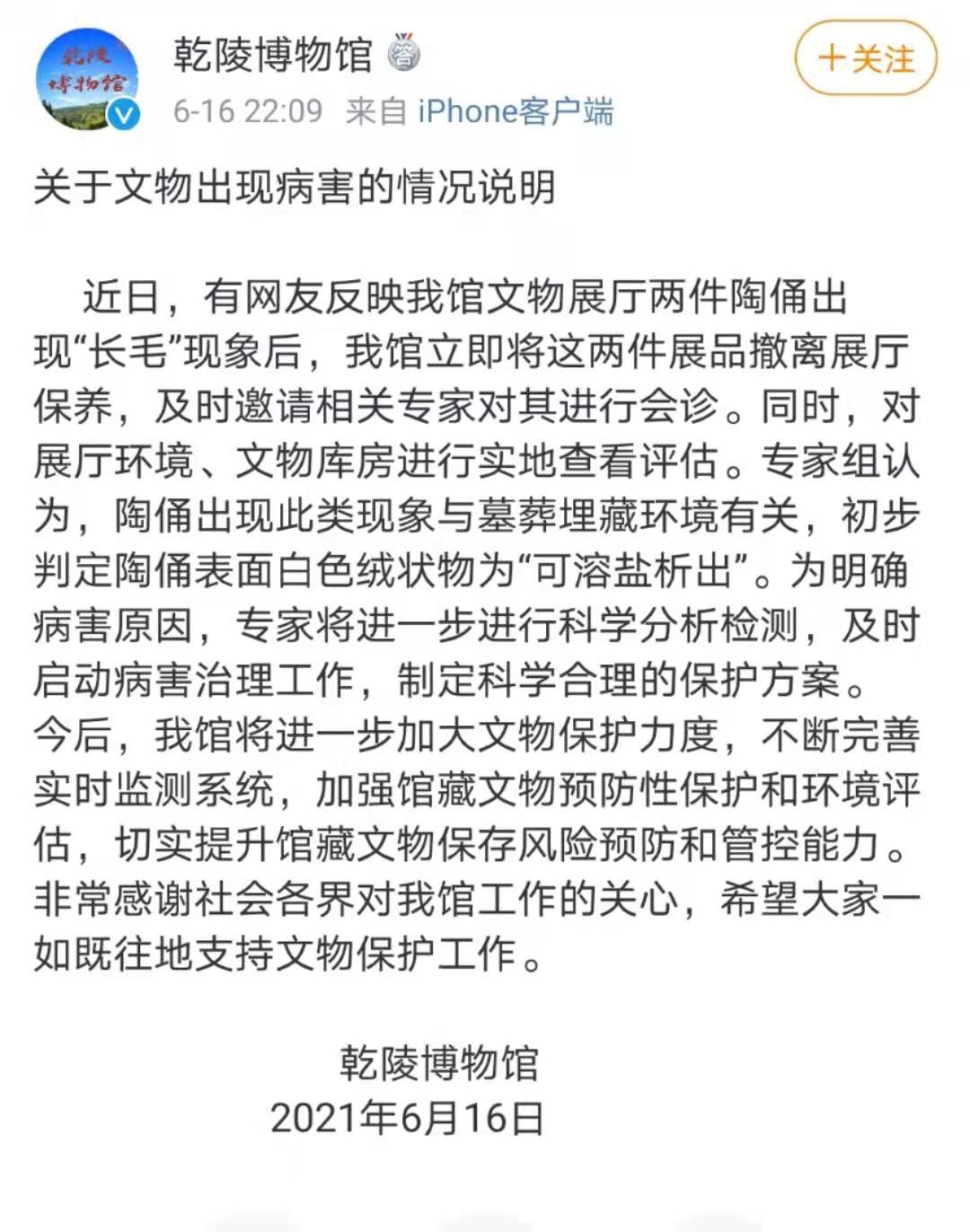 6月16日晚,乾陵博物馆发布《关于文物出现病害的情况说明》称,该馆立即将这两件展品撤离展厅保养,及时邀请相关专家对其进行会诊。同时,对展厅环境、文物库房进行实地查看评估。今后,该馆将进一步加大文物保护力度,不断完善实时监测系统,加强馆藏文物预防性保护和环境评估,切实提升馆藏文物保存风险预防和管控能力。