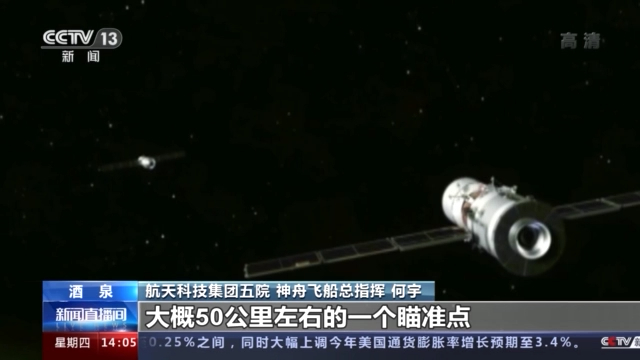 航天科技集团五院 神舟飞船总指挥 何宇:(飞船绕地球)一圈的话是1.5个小时左右。一般是前三圈,每圈做两次变轨,就完成了6次变轨,然后就到达了离空间站大概50公里左右的一个瞄准点。