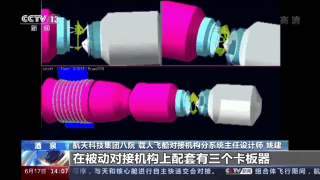 航天科技集团八院 载人飞船对接机构分系统主任设计师 姚建:装在载人飞船上的叫主动对接机构,对接环主动伸出去、然后在主动对接机构上配套的有三把捕获锁,在被动对接机构上配套有三个卡板器,这个就像咱们的门栓和门锁一样,两个飞行器对接环接触上之后,捕获锁就把两套对接机构锁住了。