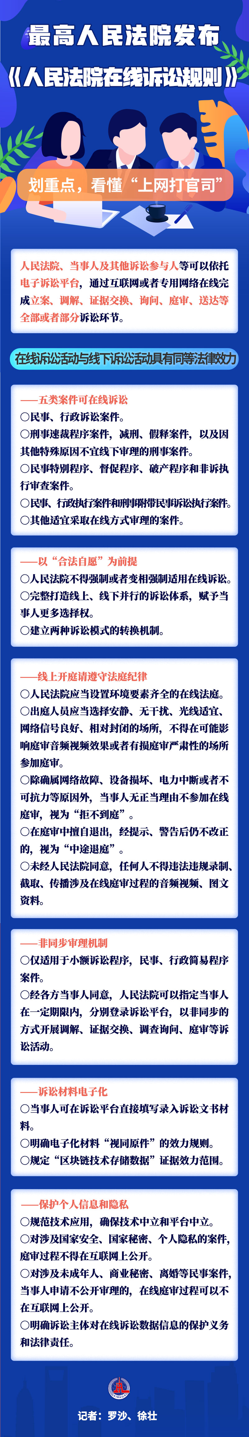 在线法庭,你体验过吗?数据显示,2020年1月1日至2021年5月31日,全国法院在线开庭128.8万次。为推进和规范在线诉讼活动,最高人民法院17日发布《人民法院在线诉讼规则》,明确在线诉讼“合法自愿”原则,强调在线庭审不得随意录音录像等。看大图,为你划重点。