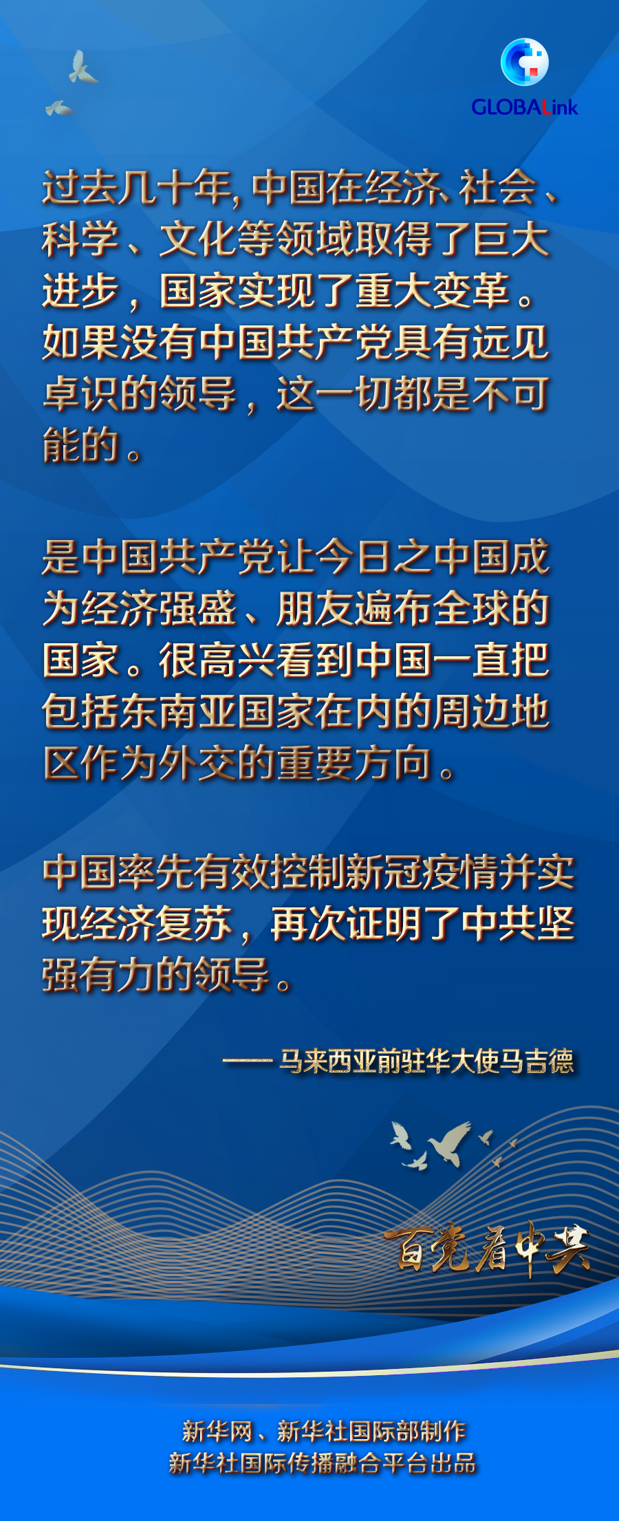 马吉德说,是中国共产党让今日之中国成为经济强盛、朋友遍布全球的国家。中国在中共领导下采取了务实的外交方针,在经济领域以及维护世界和平与稳定方面作出了贡献。他表示,很高兴看到中国一直把包括东南亚国家在内的周边地区作为外交的重要方向。
