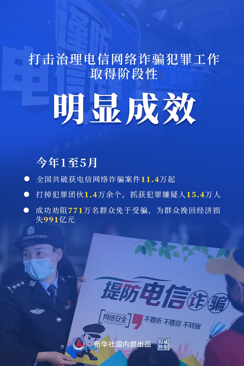 今年5月,全国共立电信网络诈骗案件8.46万起,与4月相比下降14.3%