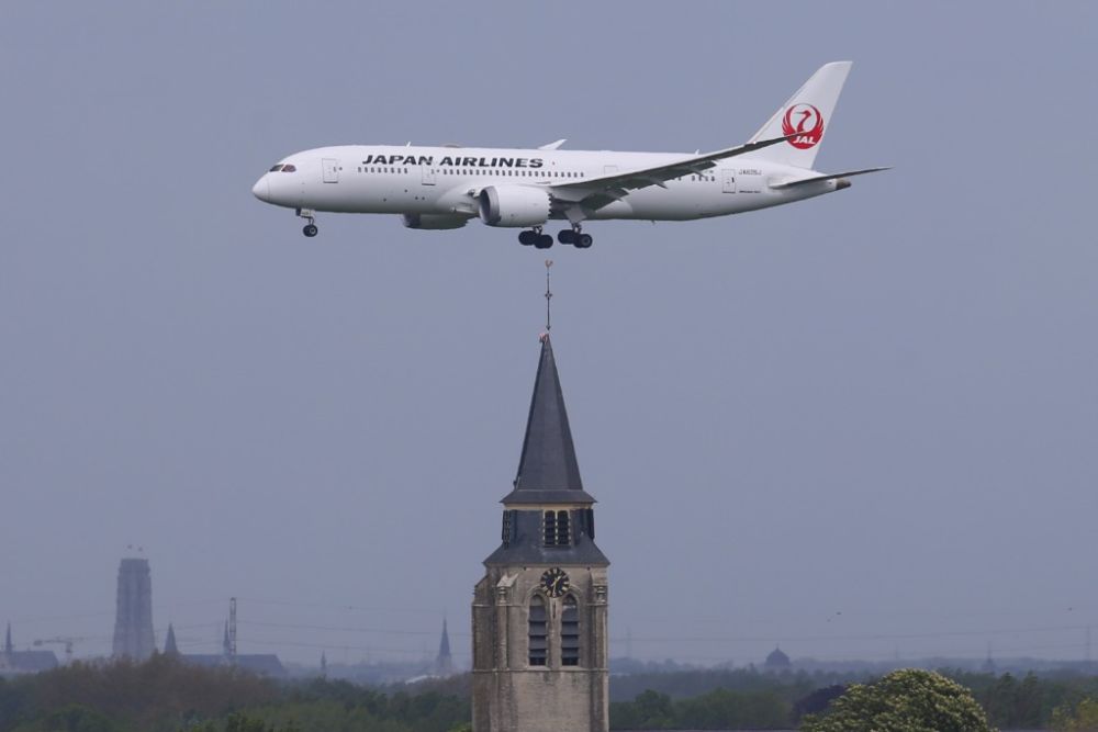 5月21日,一架日本航空公司客机准备在比利时布鲁塞尔机场降落。(新华社记者郑焕松摄)
