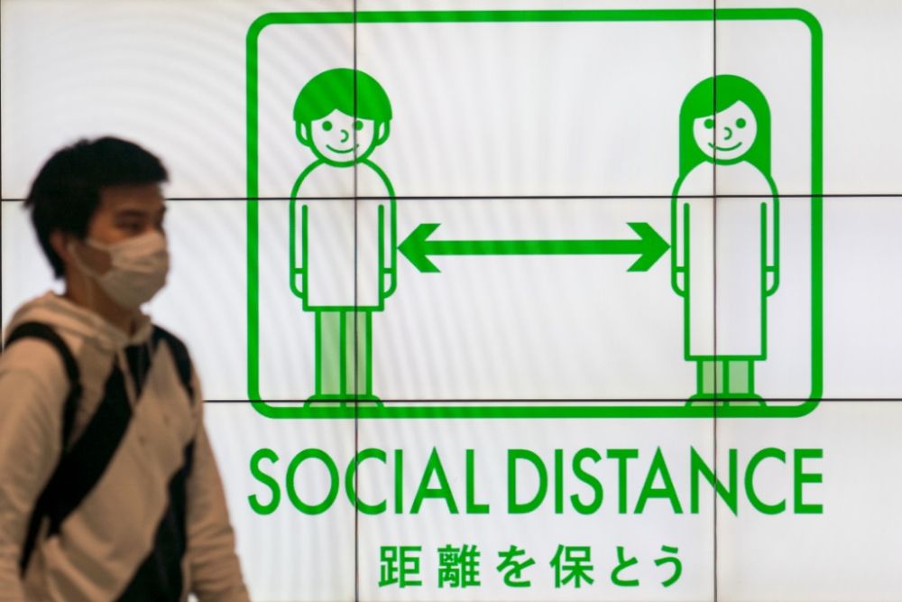 4月23日,日本东京的行人走过街头提醒人们保持社交距离的标识。(新华社发,克里斯托弗·朱摄)
