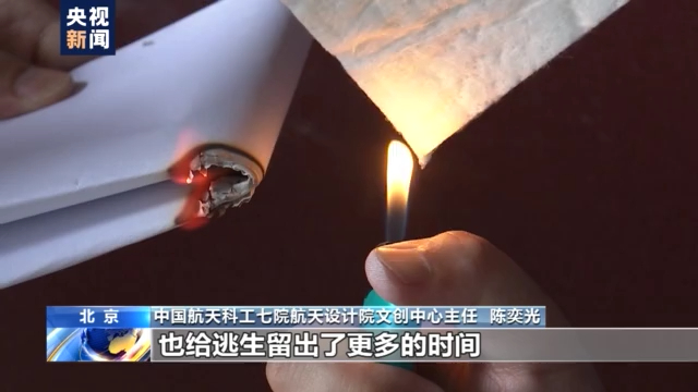 中国航天科工七院航天设计院文创中心主任 陈奕光:同时应用在我们新能源的汽车上,就是电池每个模块之间附上这种材料,隔热作用是非常大的,大大减少了因为能源电池温度过高而引起火灾事故的可能性。如果有火灾发生,也给逃生留出了更多的时间。