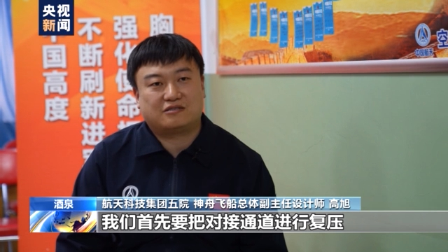 航天科技集团五院神舟飞船总体副主任设计师 高旭:我们首先要把对接通道进行复压,让它的压力与两边的飞行器舱内压力达到一个平衡,这样的话航天员就可以比较方便的打开我们轨道舱的前舱门,然后进入这个对接通道。