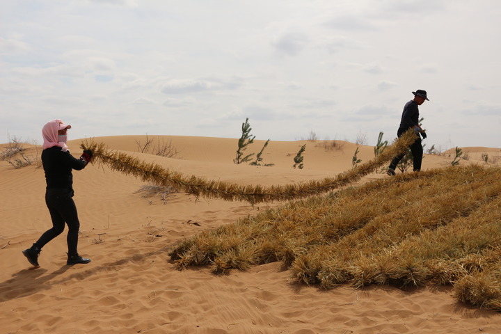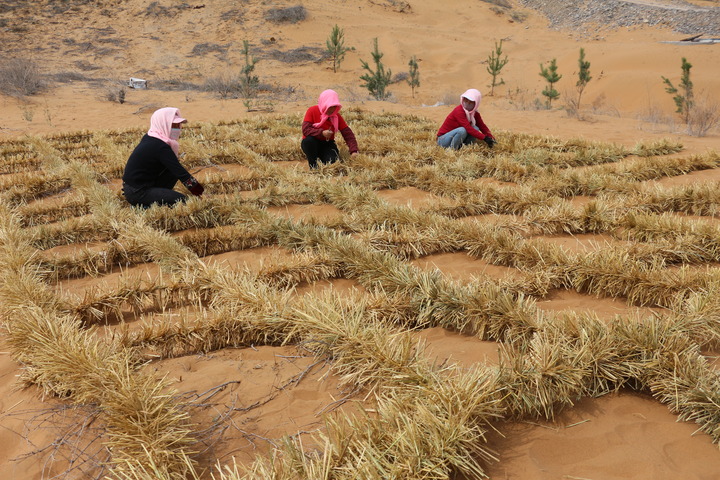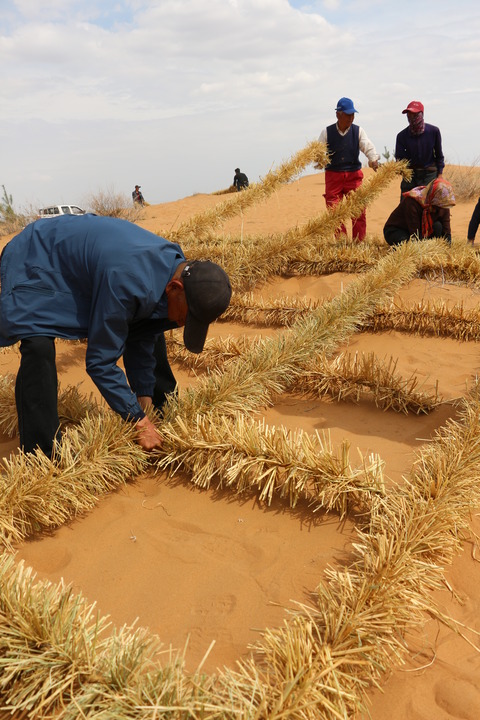 在宁夏回族自治区中卫市市区西北方向约5公里外的金沙海治沙区,工人们两人一组,熟练地将麦草制成的刷状网绳按照1米×1米的大小铺成沙障。相比以往人工用铁锹将麦草扎进沙地制作草方格的方法,这种网绳只需固定四周就可以。