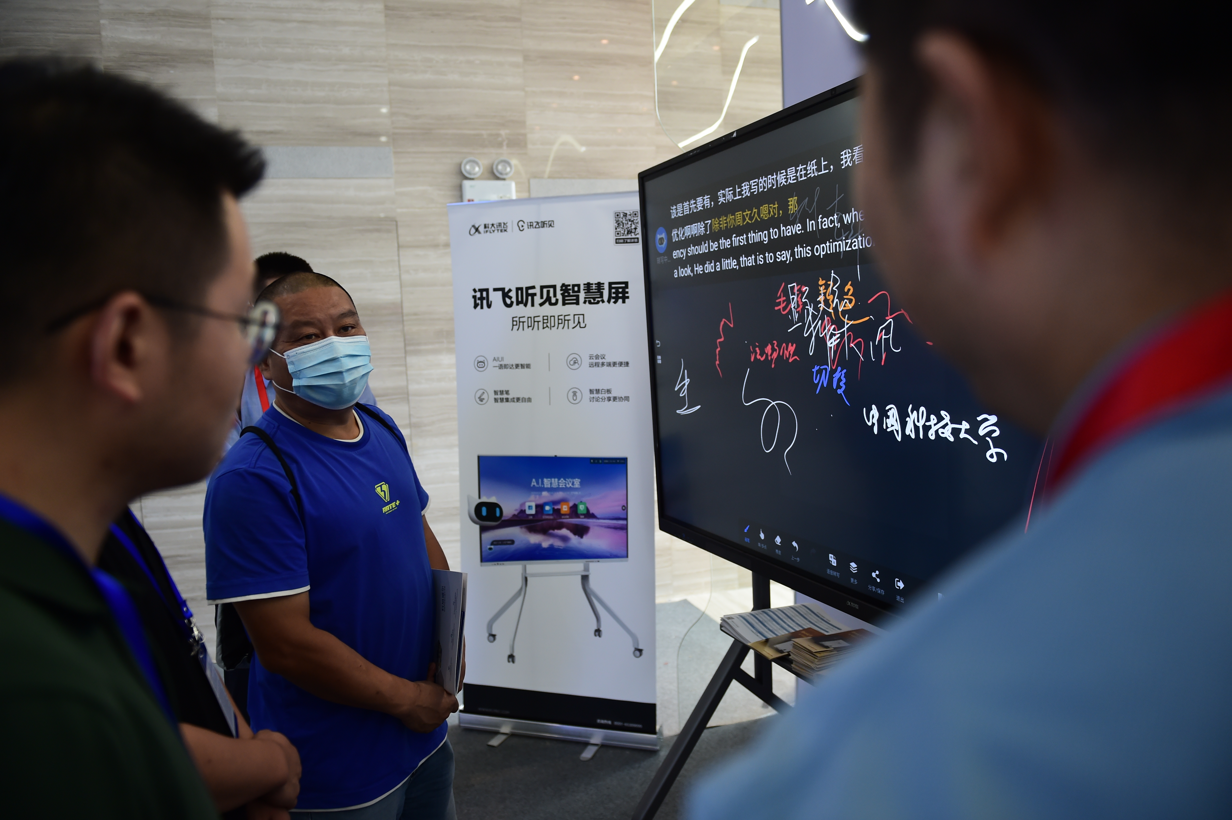 深耕人工智能和语音识别的科大讯飞,这次展示了用于会议场景的讯飞听见智慧屏。这块屏幕集成了投影、白板书写、语音识别、云端会议、会议记录自动生成等多种功能。“这是新型显示和人工智能的强强联合。”展台工作人员廖纯生说,显示产业与其他产业对接合作已逐渐成为主流,未来新型显示和人工智能将无处不在。