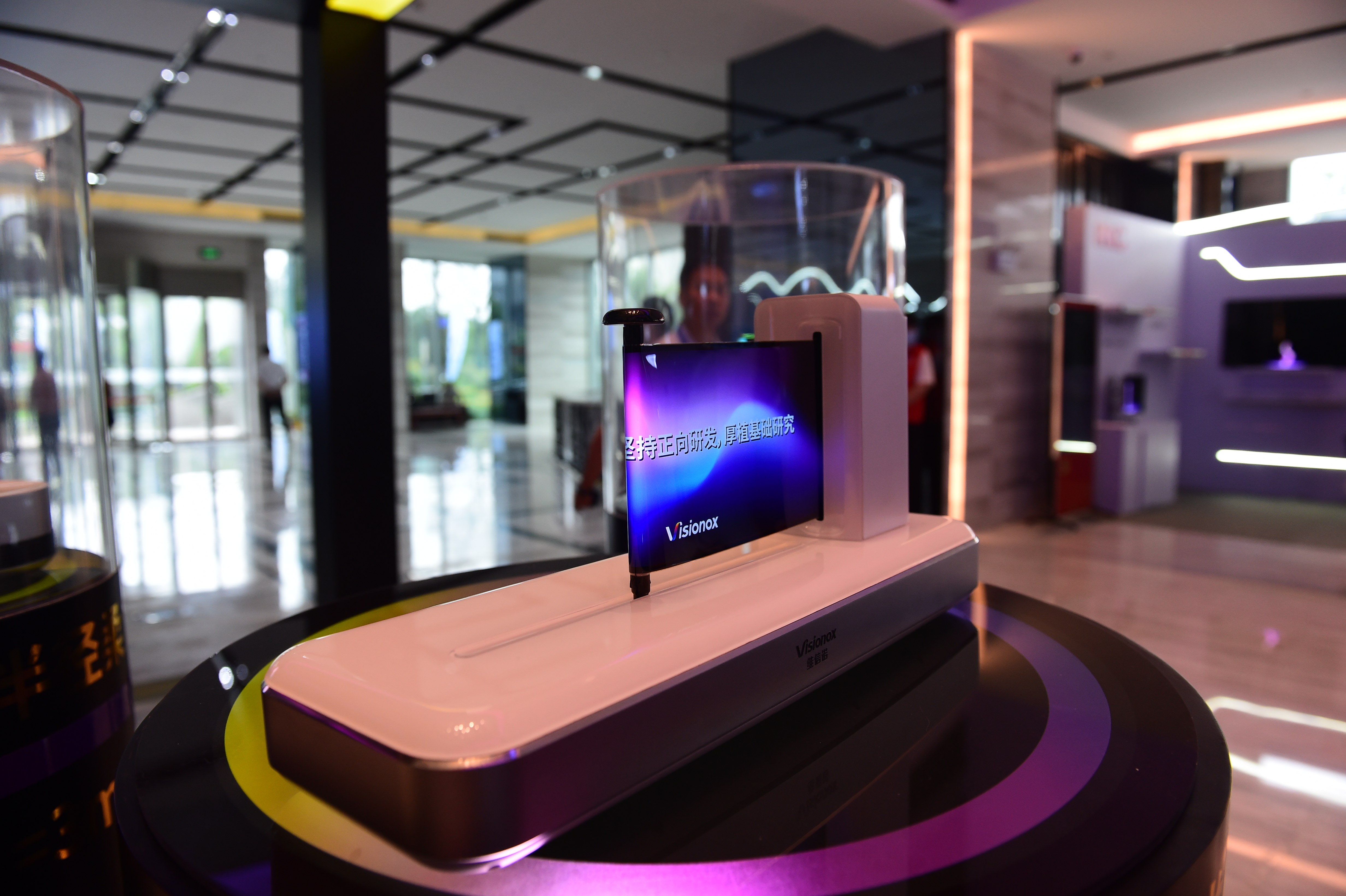 在维信诺科技股份有限公司展台,多款高科技柔性显示产品中,一块像纸一样可自由卷曲折叠的柔性显示屏,格外引人注目。