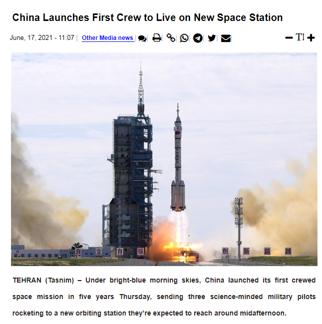 伊朗主流媒体塔斯尼姆通讯社在神舟十二号载人飞船发射成功当天发表文章,对发射过程和此次太空远征任务的相关信息做了详细介绍。文章还介绍了中国航天事业近半年来取得的重大成就,称中国的航天事业信心和能力日益增强。