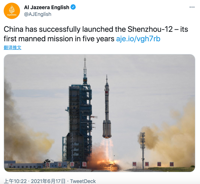 阿拉伯半岛电视台在推特中表示,中国成功发射神舟十二号——五年来首次载人飞行。