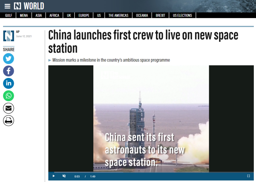 阿联酋《国家报》17日发表文章《中国向新空间站派出第一批宇航员》,并在副标题称这是中国航天事业具有里程碑意义的一次任务。文章还嵌入转播了神舟十二号载人飞船发射成功的过程。
