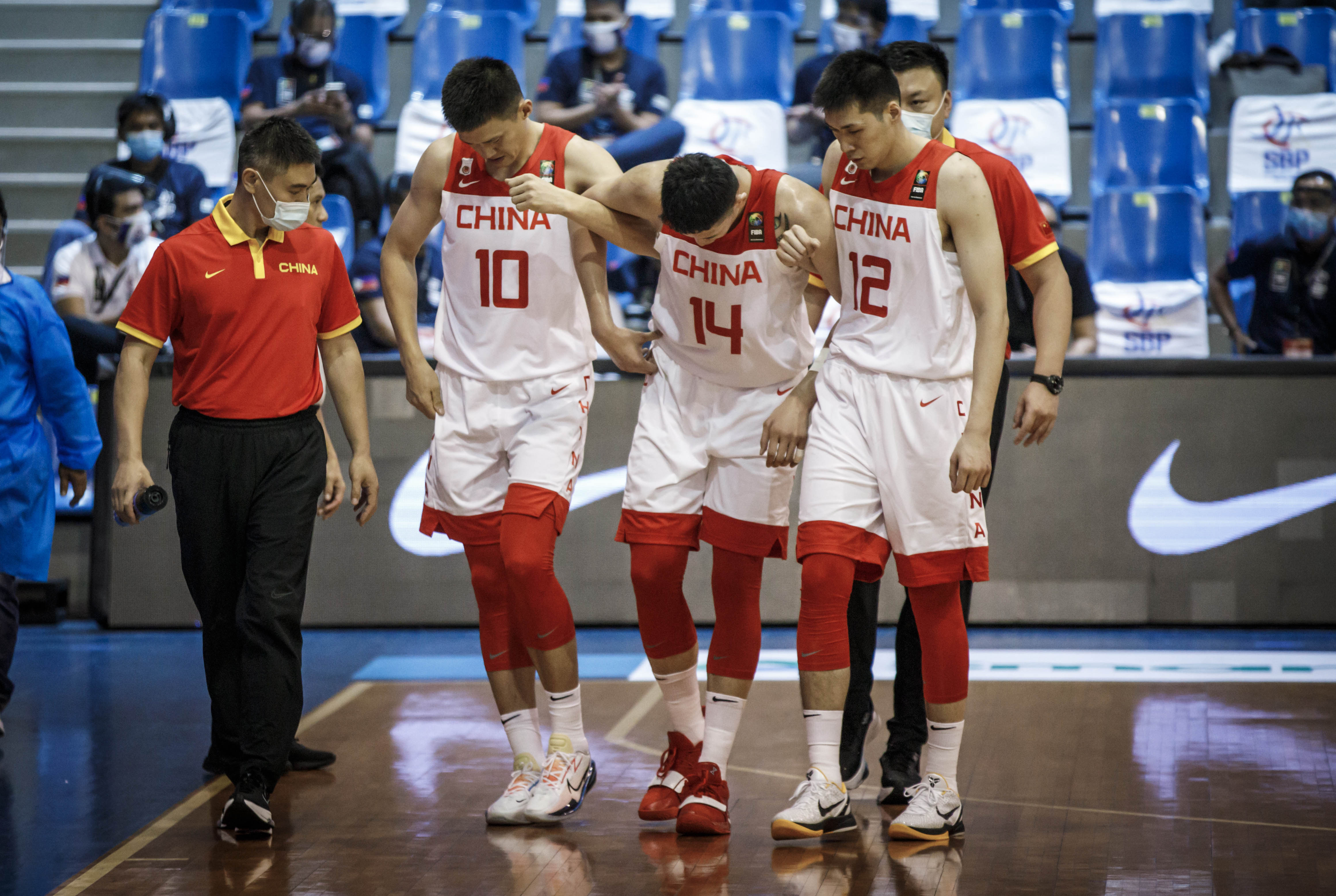6月17日,中国队球员沈梓捷(左三)在比赛中受伤离场。新华社发国际篮联供图