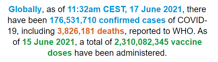 根据世卫组织最新实时统计数据,截至欧洲中部夏令时间6月17日11时32分(北京时间6月17日17时32分),全球累计新冠肺炎确诊病例176531710例,累计死亡病例3826181例。(总台记者 朱赫)
