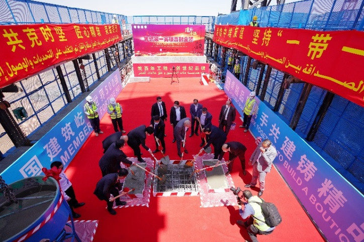 当地时间6月17日上午,由中国建筑股份有限公司埃及分公司承建的埃及新行政首都中央商务区标志塔主体结构封顶。在封顶仪式现场,埃及住房部长阿西姆·加扎尔、中建埃及公司总经理常伟才等中埃嘉宾共同完成标志塔最后一方混凝土浇筑。