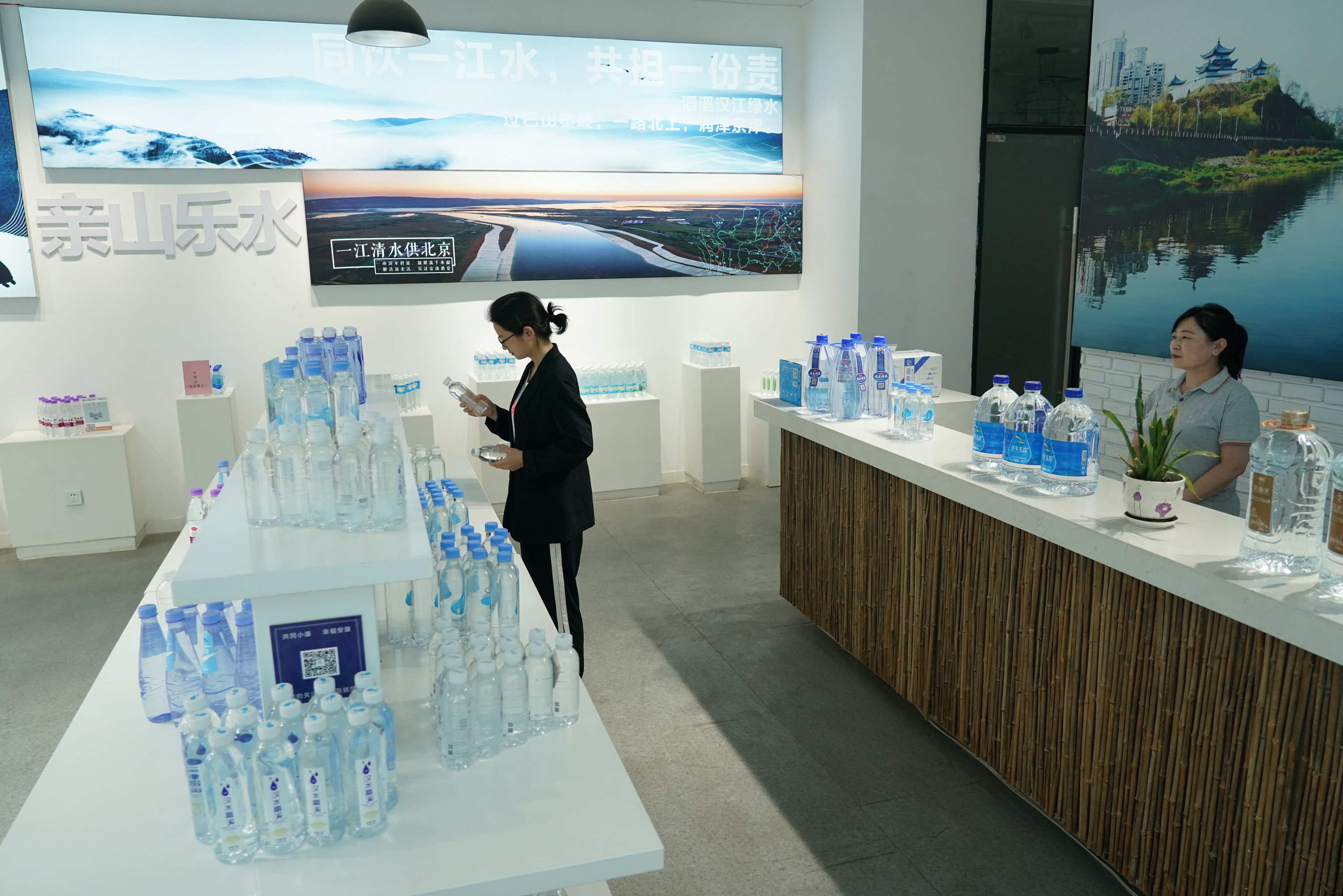 安康市扶贫空间包装饮用水馆内展示的多款产品(6月1日摄)。新华社记者邵瑞 摄