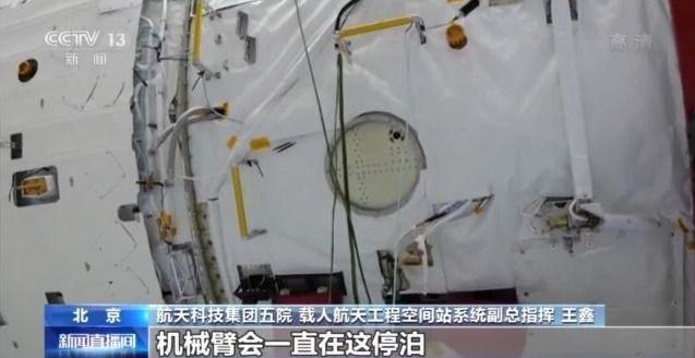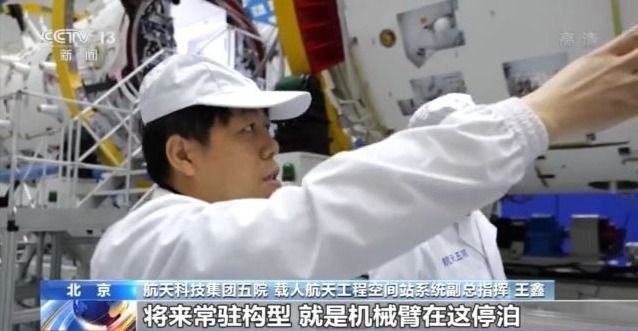 航天科技集团五院 载人航天工程空间站系统副总指挥 王鑫:有一个大柱段,有一个圆圈,将来常驻构型,就是机械臂在这停泊。