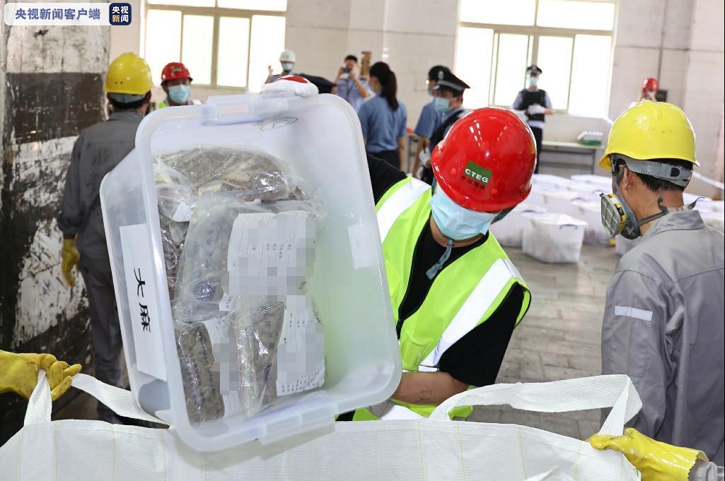销毁过程中,工作人员将40余箱封存好的毒品依次倒入大型编织袋内。在专业人员的操作下,大型机械抓手将各类毒品从地面运送至约20米高的热解气化炉中,经过最高达1200摄氏度的高温两次热解气化。销毁过程中产生的废气进行冷却、除尘、脱硫等净化处理,最终实现达标排放。