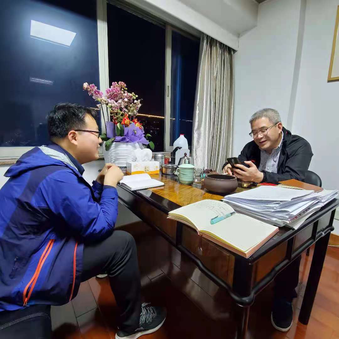 李华(图右1)接受记者采访