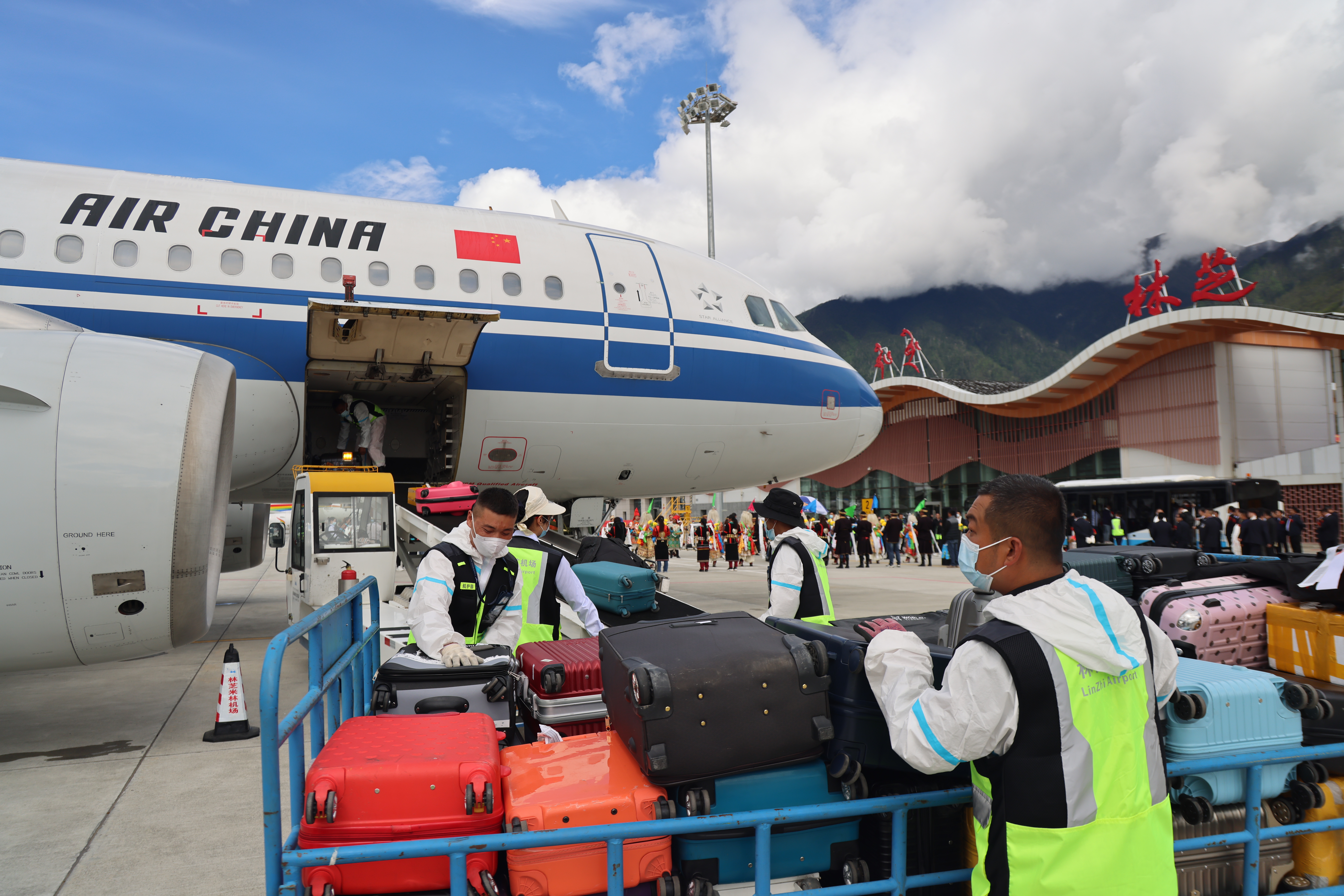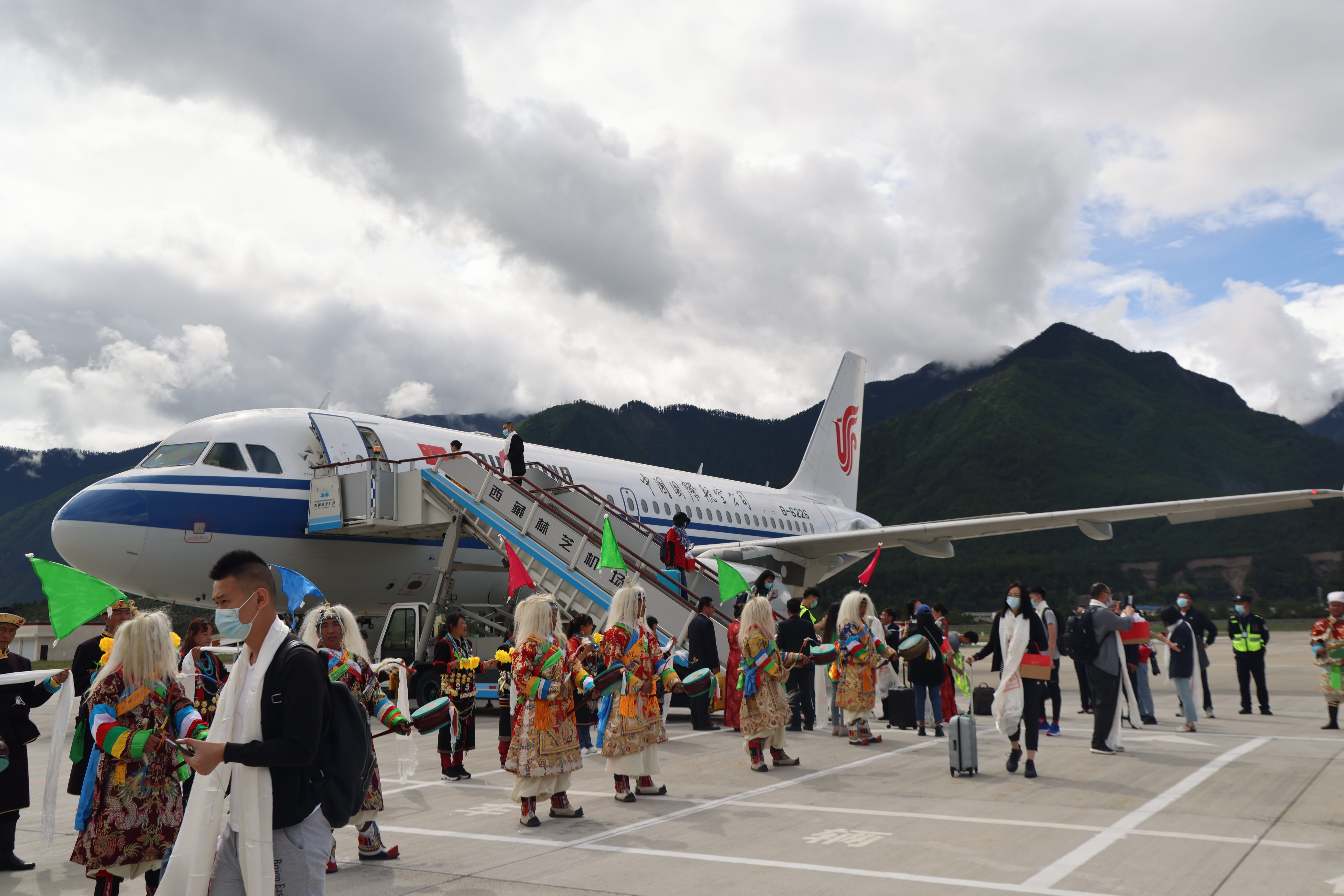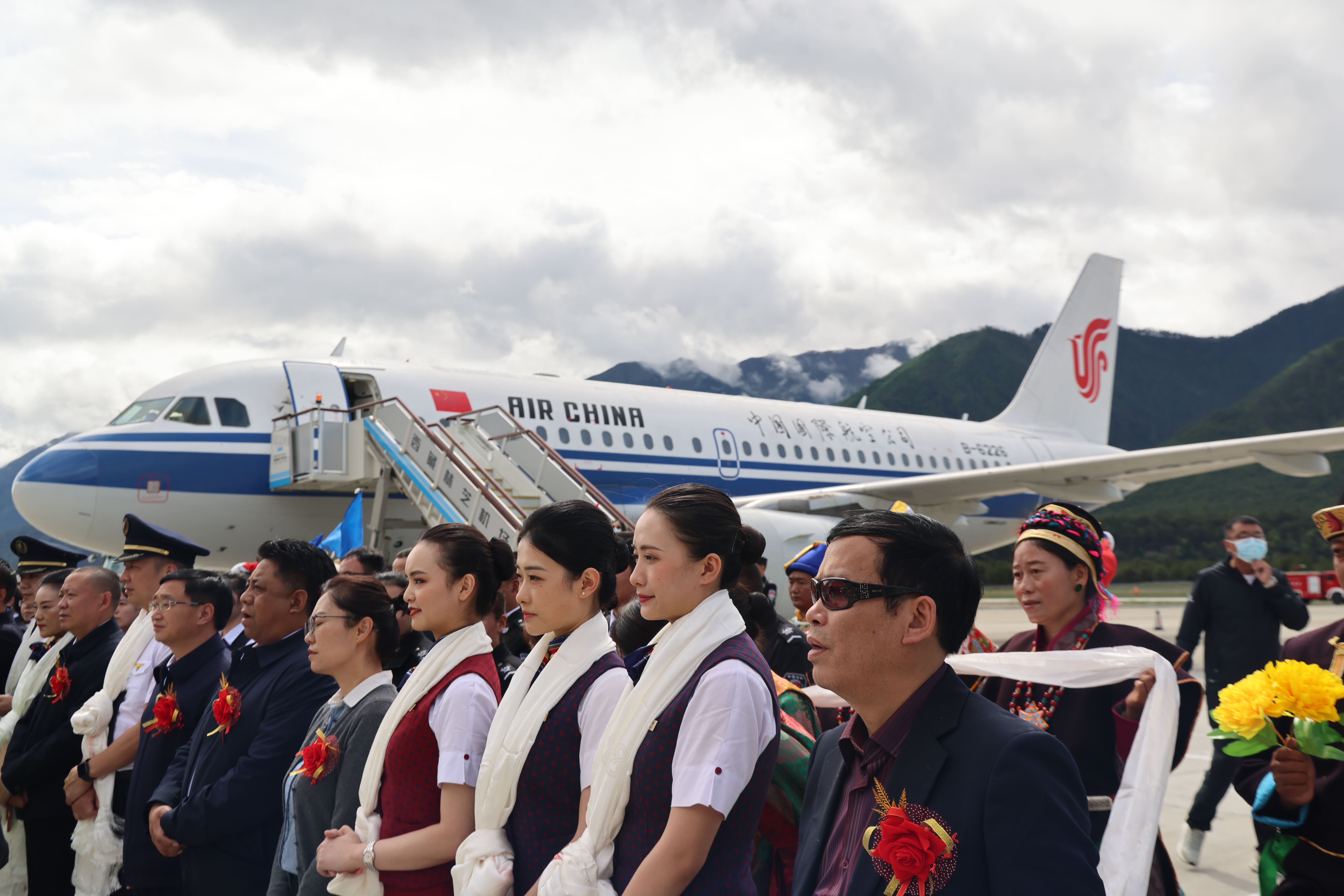 乘客和机组成员在林芝米林机场参加北京直飞林芝航线复航仪式(2021年6月18日摄)。新华社记者刘洪明摄