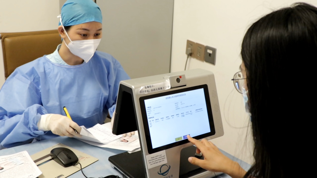 6月18日,广东祈福医院新冠疫苗接种点,进行接种的市民利用电子登记系统确认接种信息。新华社记者 洪泽华 摄
