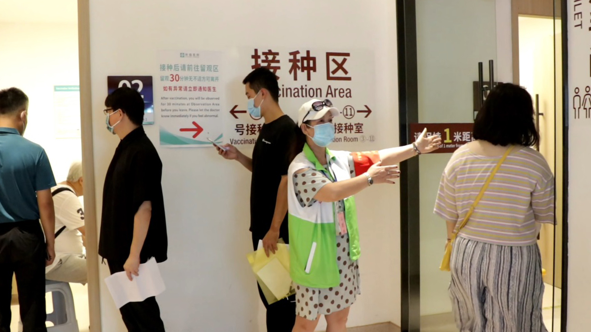 6月18日,广东祈福医院新冠疫苗接种点内,志愿者正引导市民有序接种。新华社记者 洪泽华 摄