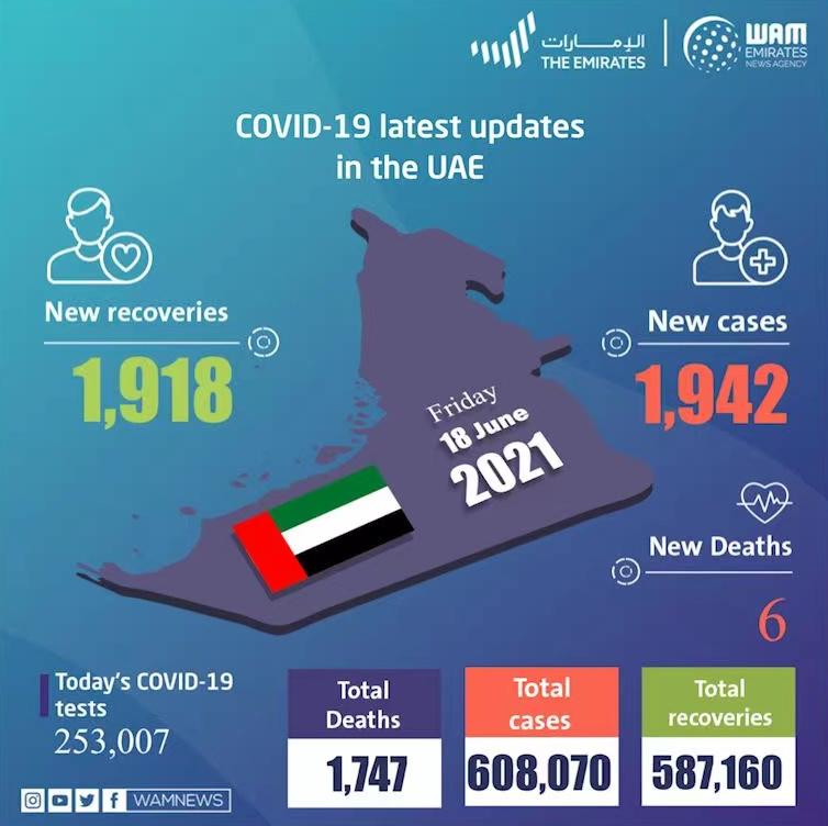 据阿联酋卫生与预防部于当地时间6月18日公布,阿联酋当天新增1942例新冠肺炎确诊病例,另外新增1918例治愈病例,新增6例死亡病例。截至目前,阿联酋累计确诊病例608070例,累计治愈587160例,累计死亡1747例。