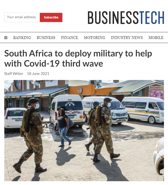 据南非媒体当地时间6月18日报道,南非代理卫生部长恩古巴内(Mammoloko Kubayi-Ngubane)当日在媒体通报会上表示,因该国近期疫情肆虐,因此政府将部署军队协助抗疫。