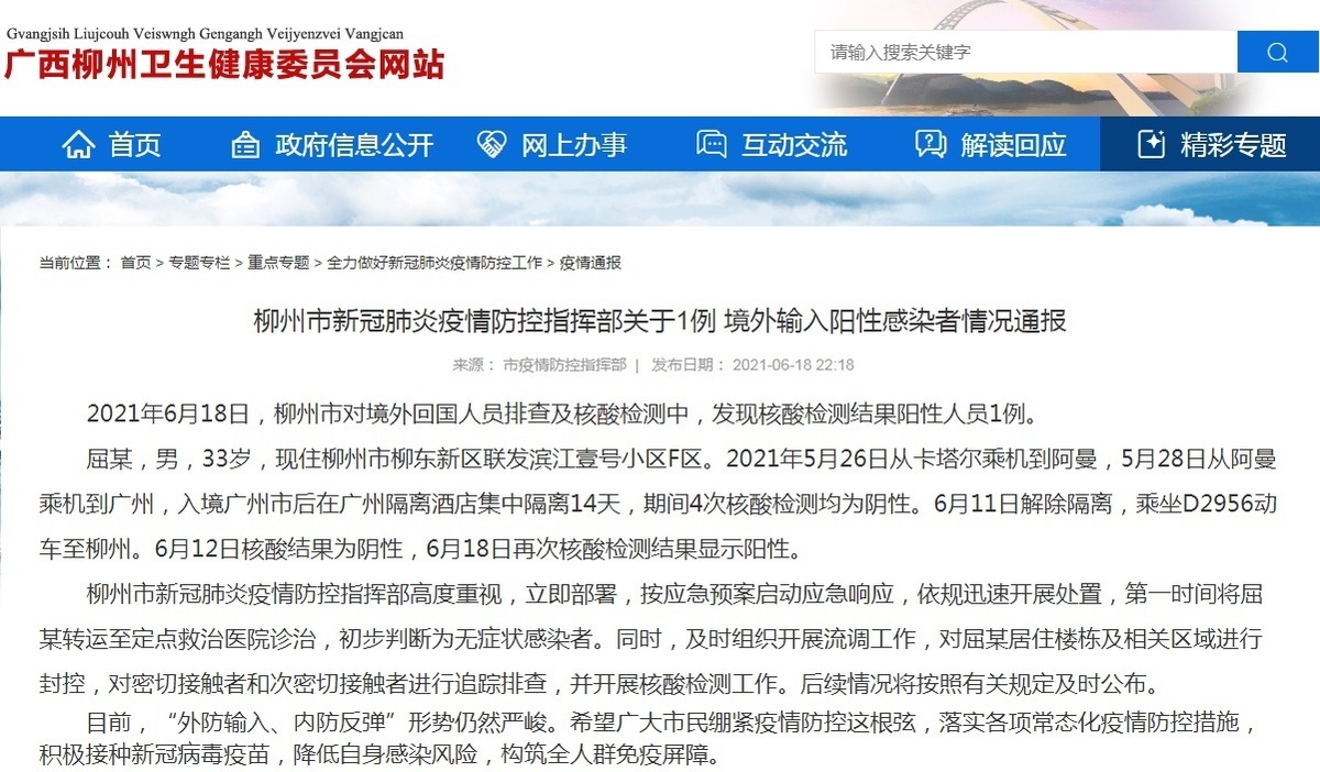 6月18日晚上22时许,广西柳州卫健委网站发布《柳州市新冠肺炎疫情防控指挥部关于1例境外输入阳性感染者情况通报》。全文如下: