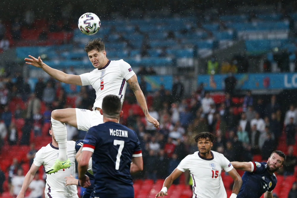 6月18日,英格兰队球员斯通斯(上)在门前抢点。新华社记者韩岩摄