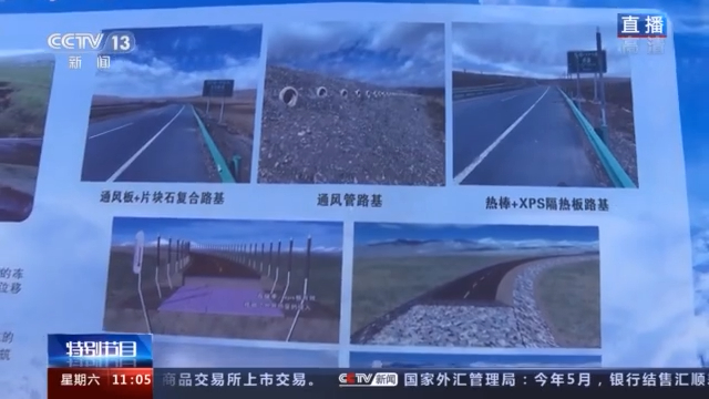 总台记者 王磊:大家看我旁边就是牧民们放牧的天然草场,顺着再往远处看就是青藏公路和青藏铁路,三条路在沿线交汇并行,非常壮观,这也是几代建设者辛勤付出的见证。而这条平均海拔在4500米的高速公路大部分处于冻土区,环境恶劣,施工难度大。什么是冻土?在冻土上修筑高速公路会遇到什么问题呢?下面我这里用两个冰袋,来给大家演示一下。冻土中含有大量的水分,就像这个冰块,冻结状态下,非常坚硬,强度高;但是随着季节的变化,而如果冰融化后就会变软,承载能力下降,路面下就会像这个融化的冰袋,大家看这辆模型车在上面行驶,路面很难承受压力,就会沉下去。为此,设计方提出了很多工程处置措施,比如在路面下埋设通风板、通风管和热棒等设施来调控冻土的温度,在我们看不到的路面下方其实就是这样的结构,通过几代建设者不断地努力,让我们未来的行驶更安全和舒畅。
