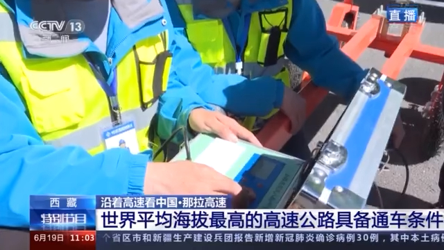 总台记者 王磊:我现在就是在世界平均海拔最高的高速公路那拉高速羊八井至那曲段的起点上。这里的海拔是4380米,现在我们可以看到有不少工程车正在对最后一段路面进行技术检测。我旁边正在调试的设备叫作八轮仪,主要是用来检测路面的平整度,一旦路面的高差大于1.2毫米,仪器就会发出预警。而在我前方还有两台桥梁检测车,对桥梁的外观和质量进行检测。