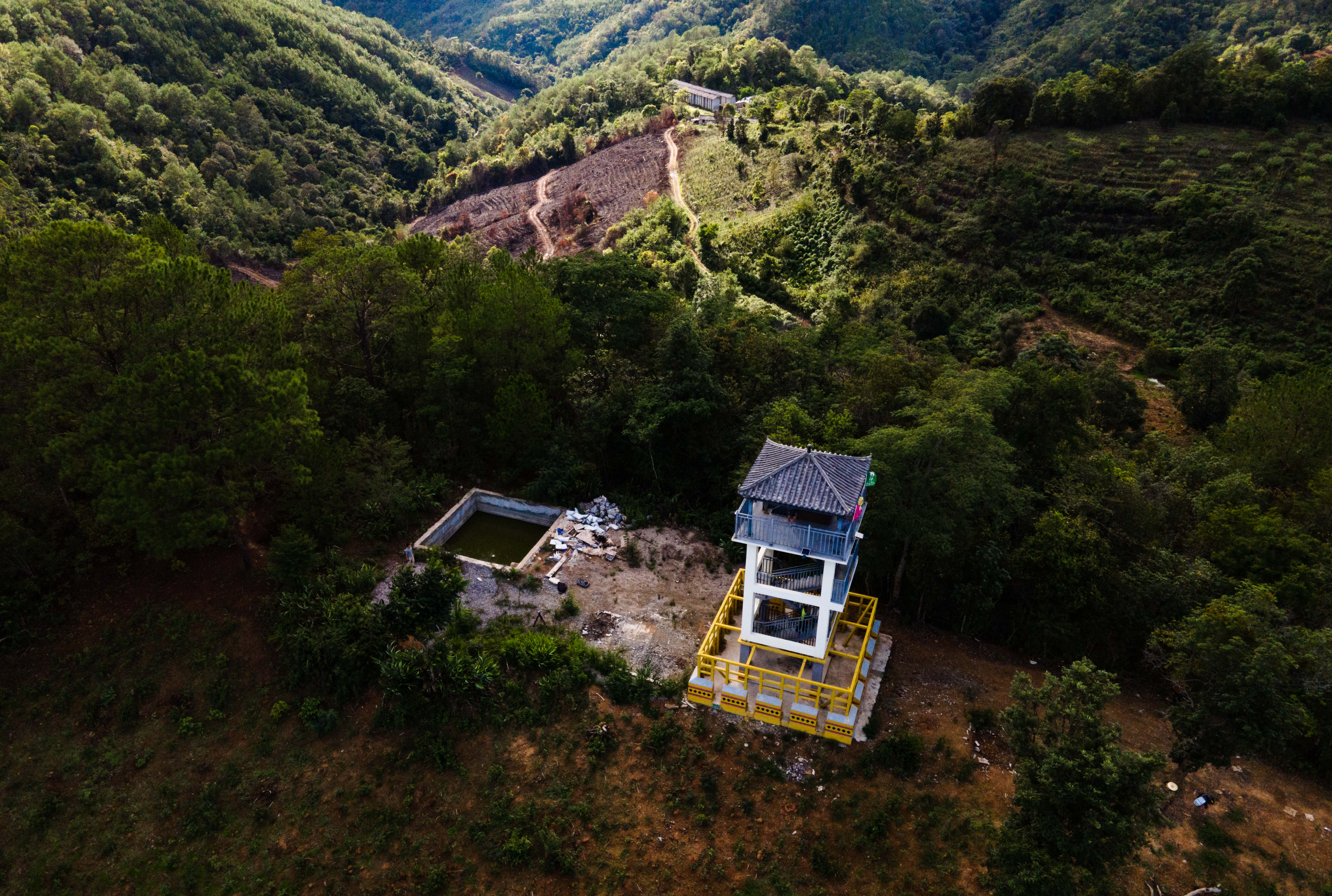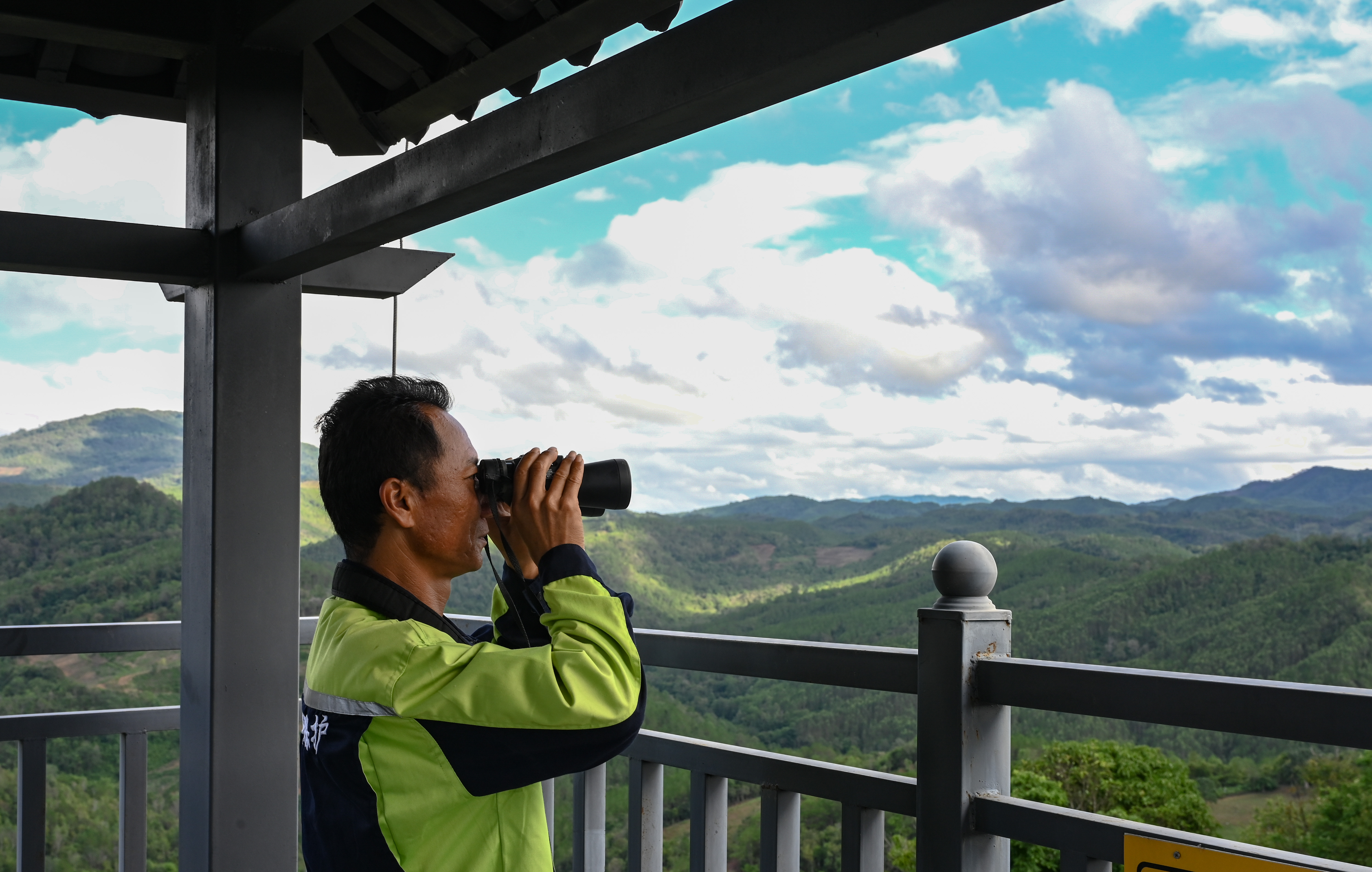 在思茅区六顺镇一座数米高的观测塔上,杨忠平正手持望远镜,瞄准远处的密林。
